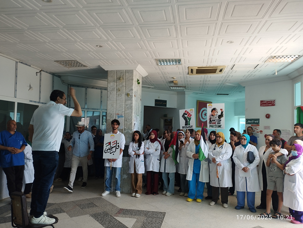 استجابة لدعوة النقابة الأساسية نفّذ أعوان المستشفى الجامعي الحبيب بوقطفة ببنزرت اليوم الثلاثاء وقفة دعم ومساندة لقافلة الصمود لكسر الحصار عن غزة.