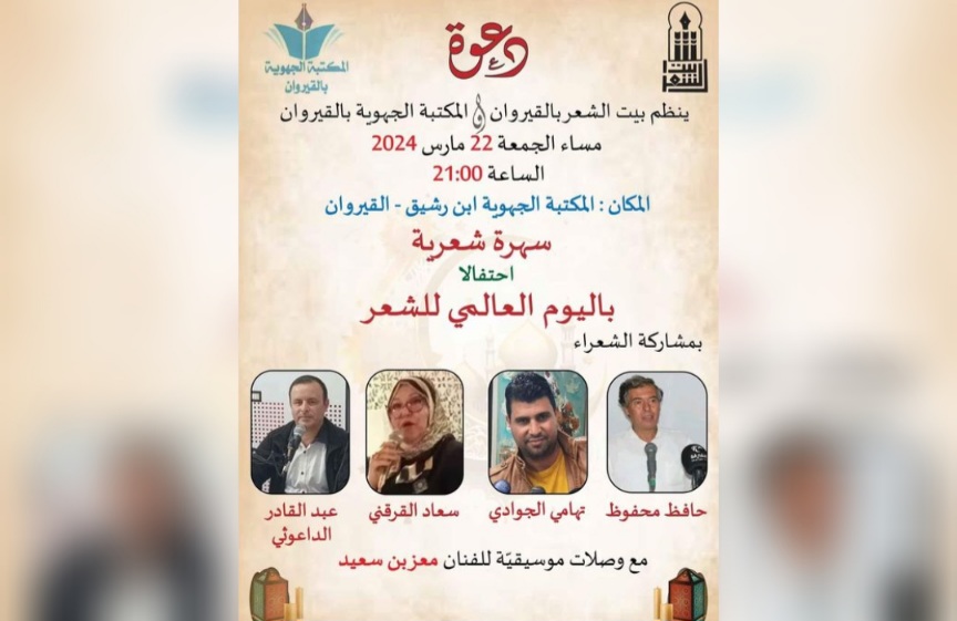 ينظم بيت الشعر بالقيروان بالشراكة مع المكتبة الجهوية غدا الجمعة 22 مارس 2024 على الساعة التاسعة مساء سهرة شعرية آحتفالا باليوم العالمي للشعر.