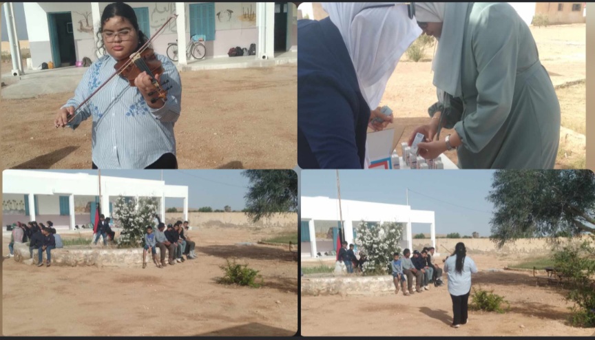 وبحسب ذات المصدر تم استقبال التلاميذ بعزف مقطوعات موسيقية أمنتها التلميذة كرامة نومة وسط الساحة ثم تم توزيع مشروبات وحلويات مع ورقة صغيرة للتحفيز .