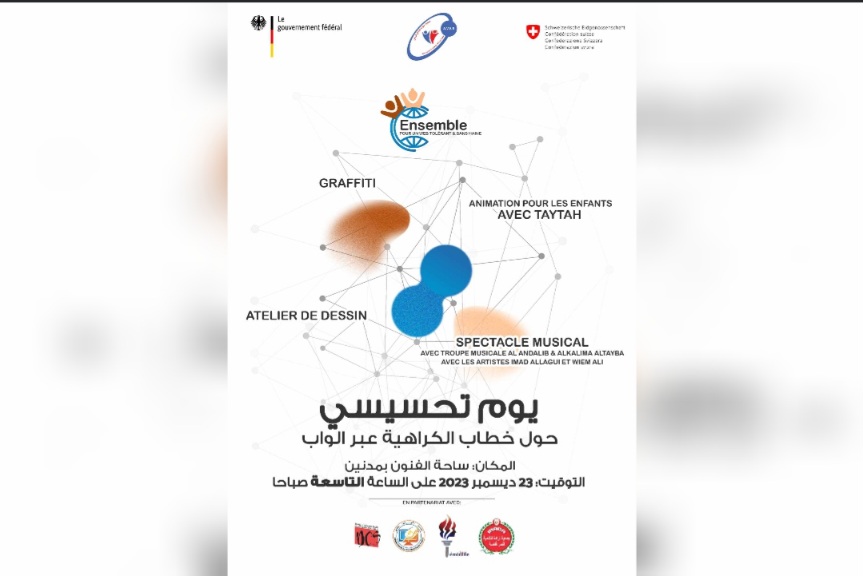 في إطار مشروع ” معا من أجل واب متسامح و خال من الكراهية ” تتواصل الاستعدادات من قبل جمعية صوت الطفل الريفي لتنظيم يوم تحسيسي يوم السبت 23 ديسمبر الجاري بساحة الفنون بمدينة مدنين بداية من الساعة التاسعة صباحا .