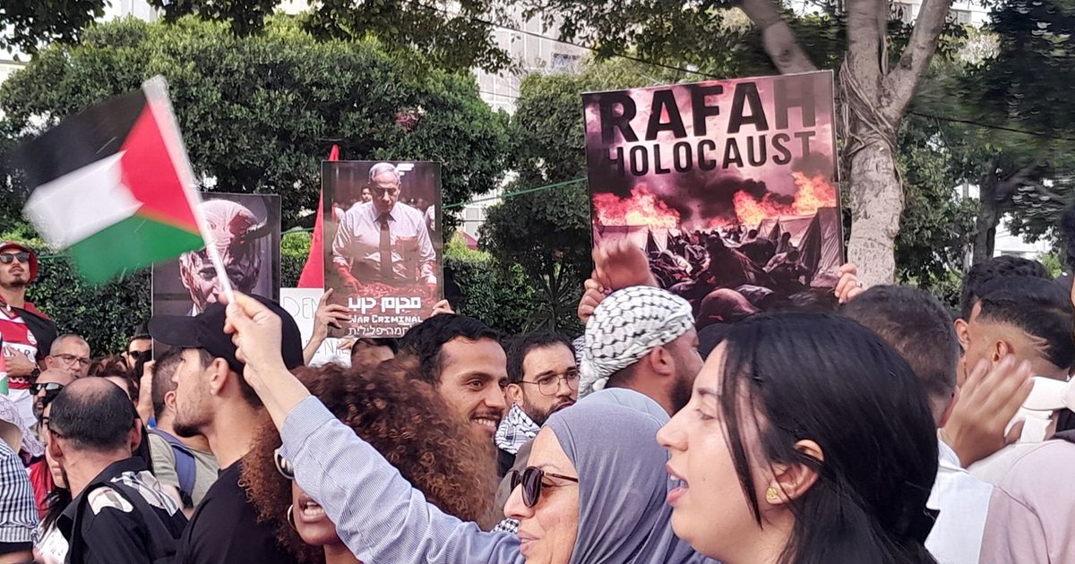 وأظهرت مقاطع مصورة بثتها منصات محلية، لحظات تدخل رجال الشرطة بعنف وإلقائهم الغاز المسيل للدموع من أجل فض التظاهرة المناهضة لجرائم الاحتلال الإسرائيلي.تونستظاهر المئات من التونسيين تنديدا بمجزرة حرق الخيام برفح، وندد المتظاهرون بشدة بجرائم الاحتلال وحرقه للأطفال والنساء مستنكرين الصمت العربي وخاصة من مصر عبر ترديد شعارات من قبيل “رفح شعلت نار والحكام نيام”، حسب مراسلة “عربي21”.ورفع المحتجون أيضا شعارات “النار النار الدم الدم صهيوني لازم يقتل، مقاومة مقاومة لا صلح لا مساومة، فرنسيس وأمريكان شركاء في العدوان”.واقترب المتظاهرون من مقر السفارة الفرنسية مطالبين بغلقها وطرد السفير “طرد السفير واجب، حرق السفارة واجب”، مجددين دعواتهم للسلطات التونسية بالإسراع بسن قانون لتجريم التطبيع.